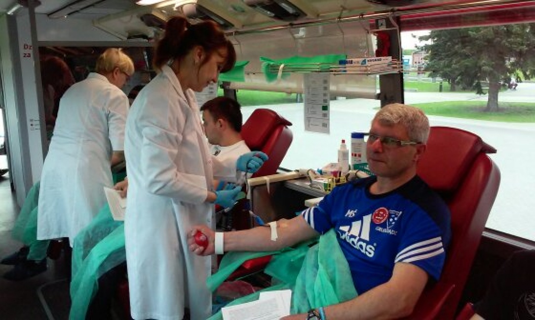 przyjeżdzamy na miejsce specjalnym autobusem przystosowanym do poboru krwi -