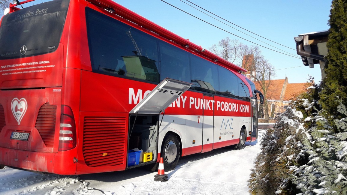 przyjeżdzamy na miejsce specjalnym autobusem przystosowanym do poboru krwi -